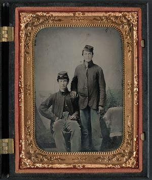 Two unidentified soldiers in Union uniforms with bayoneted muskets and pistols