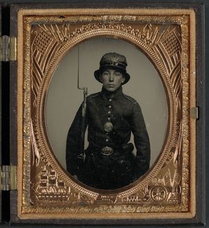 Unidentified young soldier in 5th New Hampshire Infantry uniform and Whipple hat with bayoneted musket