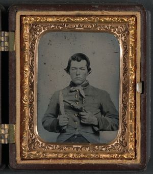Unidentified soldier in Confederate uniform with D-guard Bowie knife