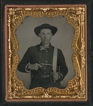 Unidentified soldier in Confederate uniform and round hat with Baby Colt Dragoon revolver and D-guard Bowie knife
