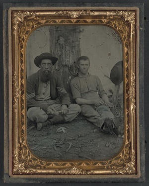 Sergeant James Bishop White of Company B, 60th Tennessee Infantry Regiment, in shell jacket with M1816/22 musket, bayonet, and Enfield cartridge box and unidentified man, possibly Jasper White, in civilian clothing