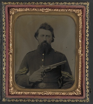 Unidentified soldier in Union sergeant's uniform and U.S. belt buckle with Savage revolver