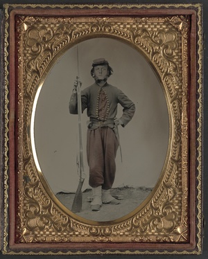 Unidentified soldier in Union zouave uniform with bayoneted musket with initials A.T. on stock