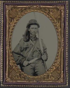 Unidentified soldier in Confederate infantry uniform with musket and Bowie knife