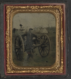 Unidentified soldier in Union uniform standing with Napoleon cannon in front of encampment