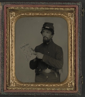 Unidentified soldier in Union uniform and U.S. belt buckle with pistol holding hand-drawn map of Virginia