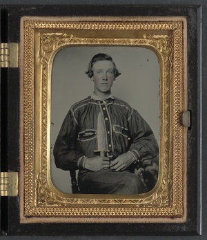 Unidentified soldier in Confederate uniform with side knife in blouse