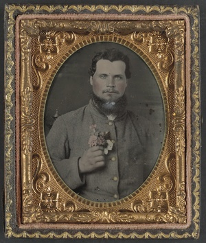 Unidentified soldier in Confederate uniform with bouquet of flowers