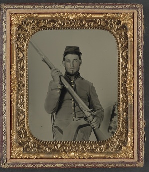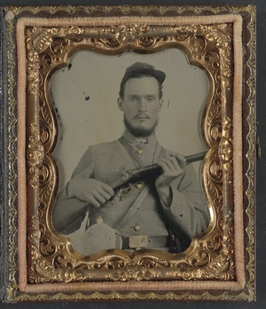 William Jenkins, North Carolina soldier, in artillery uniform, with percussion musket converted from a flintlock musket