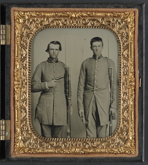 Two unidentified soldiers from Tennessee in Confederate uniforms with rifles and pepperbox pistol