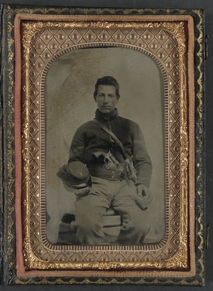 Unidentified soldier in Union uniform with Company F hat and upside down U.S. belt buckle, armed with Colt revolver and cavalry sword