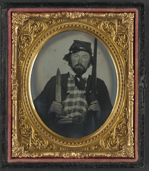 Unidentified soldier in Union uniform with bayoneted musket, knife, and pistol