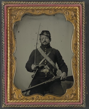 Unidentified soldier in Union uniform with musket and saber bayonet
