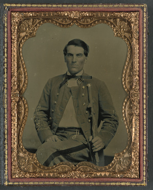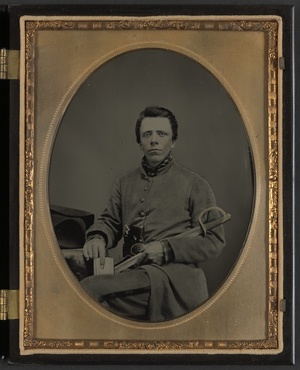 Unidentified soldier in Confederate uniform and derby hat with sword