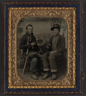 Two unidentified soldiers in Union cavalry uniforms with sword share a drink in front of painted backdrop showing camp