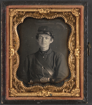 Unidentified soldier in Union uniform of the 119th Pennsylvania Volunteer Infantry, wearing the belt buckle of the Philadelphia Reserve Brigade