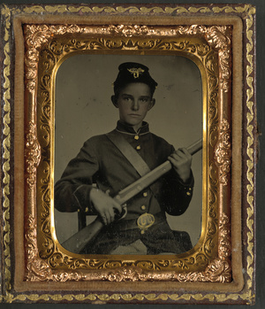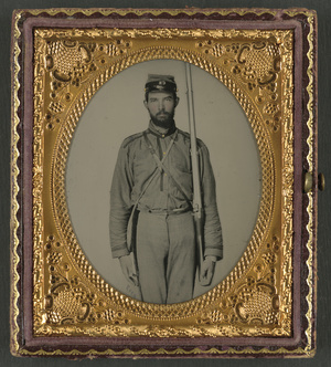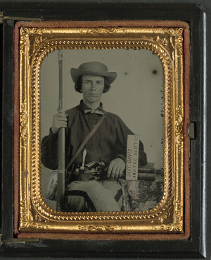 Unidentified soldier in Confederate uniform and Craig's Rifles, or 28th Virginia Infantry Regiment, kepi with musket