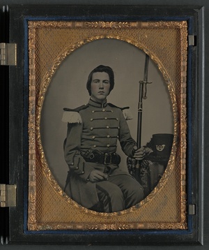 Unidentified soldier in Company H, Vermont uniform with bayoneted musket