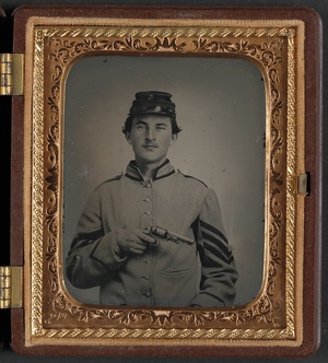 Unidentified sergeant in Confederate uniform and Company G hat with revolver