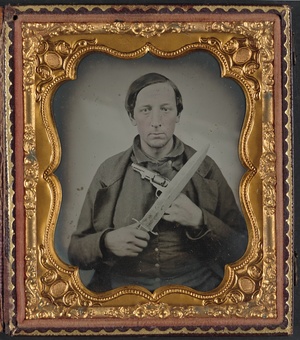 Theophilus Mann of Company G, 1st (Farinholt's) Virginia Infantry Battalion Reserves, with pistol and knife