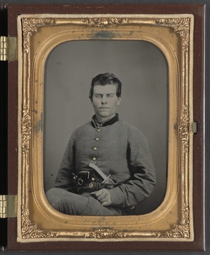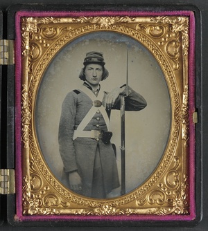 Unidentified soldier in Confederate Virginia volunteer uniform with bayoneted musket