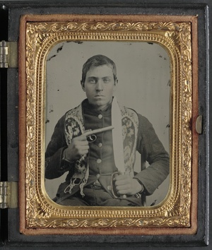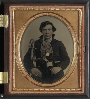 Unidentified soldier in Confederate uniform with cavalry sword and revolver