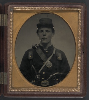 Unidentified soldier in Union uniform and state of New York belt buckle with revolver and side knife and smoking pipe