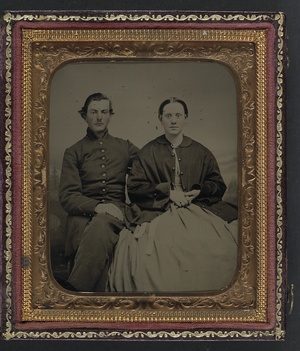 Private Luther Hart Clapp of Company C, 37th Virginia Infantry Regiment, in uniform and two-piece Virginia state seal buckle with Boyle and Gamble sword