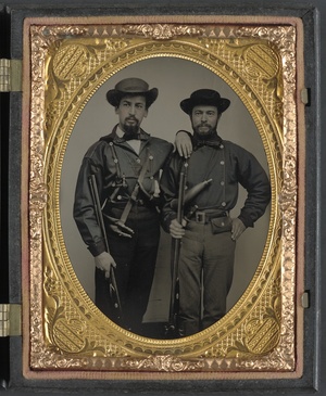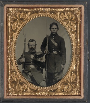 Two unidentified soldiers, possibly father and son, in Union uniforms and U.S. belt buckles with bayoneted muskets