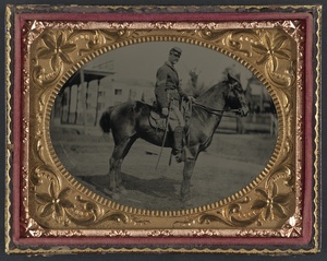 Unidentified soldier in Union sergeant's uniform with sword seated on a horse