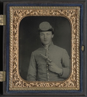 Unidentified soldier in Confederate infantry uniform with model 1842 musket and two Colt revolvers