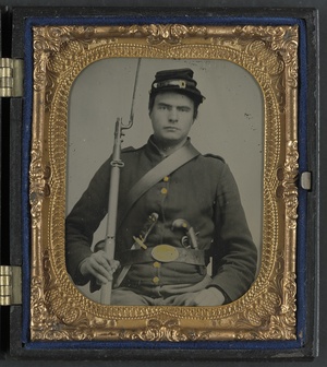 Unidentified soldier in Union uniform with bayoneted rifle musket