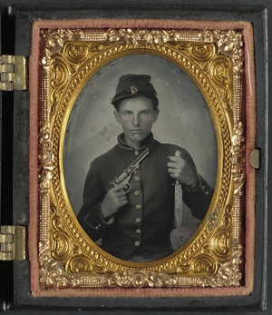 Unidentified soldier in Union uniform with Colt revolver and Sheffield side knife
