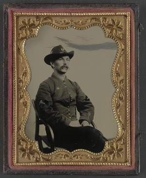 Private Benjamin W. Varnell of Co. B, 1st Texas Cavalry Regiment in uniform with plumed hat