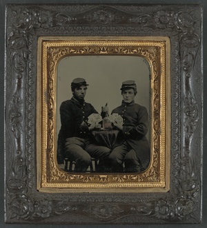Two unidentified soldiers in Union uniforms drinking whiskey and playing cards