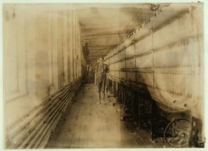 John Lavigul. Has been doffer-boy in mule-spinning room for over a year in Chace Cotton Mill, Burlington, Vt. See photo and label #730.  Location: Burlington, Vermont.