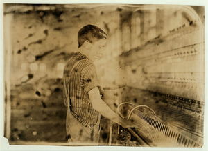 Youngsters making bands, cotton mill, North Pownal, Vt. Clarence Noel, 11 years old.  Location: North Pownal, Vermont.