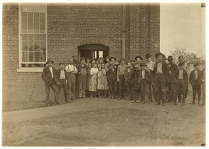 Adolescents and other in Payne Cotton Mill, Macon, Ga. Girl on end with dropping eyelids has been helping there one yr. Jan. 20, 1909. L.W.  Location: Macon, Georgia.