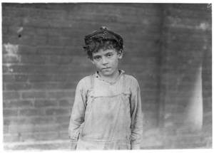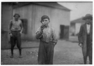 John Tidwell, a Cotton Mill Product. Doffer in Avondale Mills. Many of these youngsters smoke.  Location: Birmingham, Alabama.