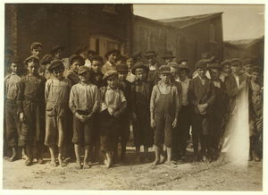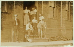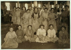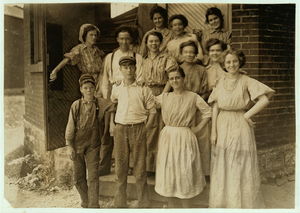Operatives in Indianapolis Cotton Mill. Noon Hour. Aug., 1908. Wit., E. N. Clopper. Location: Indianapolis, Indiana.