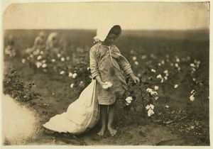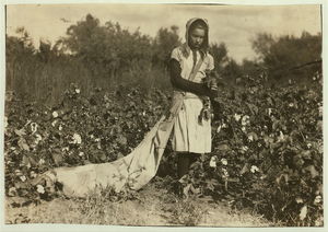 Callie Campbell, 11 years old, picks 75 to 125 pounds of cotton a day, and totes 50 pounds of it when sack gets full. "No, I don't like it very much." Lewis W. Hine. See 4590. See W.H. Swift Report. Location: Potawotamie County, Oklahoma