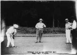 Pres. William H. Taft playing golf, Chevy Chase Country Club, 3 other men in picture, 1909 June 28