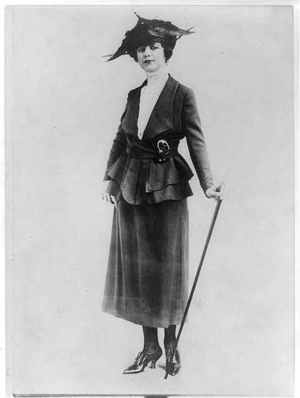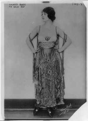 Shop girl in Los Angeles modeling a so-called "sheath" gown wearing rubber boots to show excess of modesty