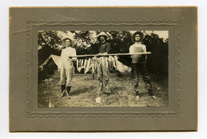 Three men in camp, with fish. There was a healthy fishing trade in Texas.
