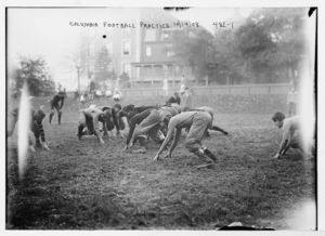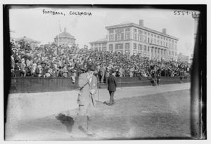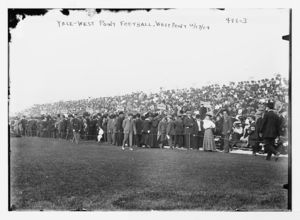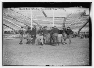 Howard Jones instructing Yale Varsity football team on playing field, New York