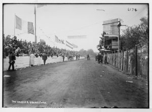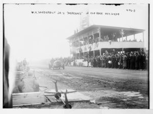Vanderbilt Cup Auto Race, W.K. Vanderbilt, Jr.'s "Mercedes" on track in front of grandstand