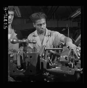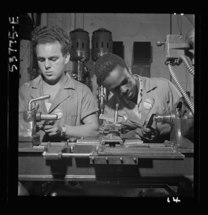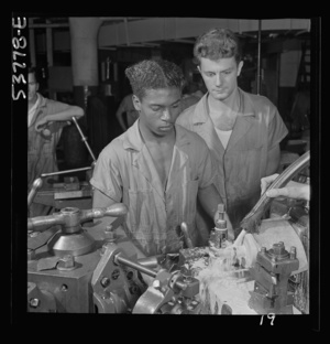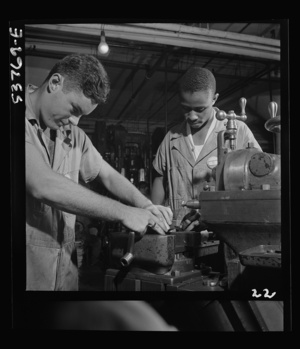 NYA (National Youth Administration) work center, Brooklyn, New York. Two turret-lathe workers, Negro and white, who are receiving training in machine shop practice, watching a cutting-off operation on a turret lathe