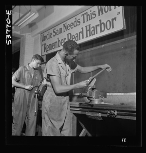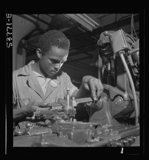 NYA (National Youth Administration) work center, Brooklyn, New York. A Negro turret-lathe worker, who is receiving training in machine shop practice, learning a filing operation on a turret lathe