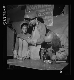 NYA (National Youth Administration) work center, Brooklyn, New York. Two Negro welders, who are receiving their training in machine shop practice, building up an undersize shaft by arc welding to be re-machined to size