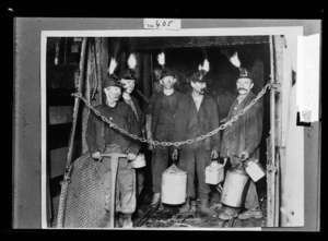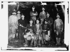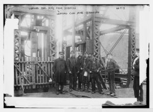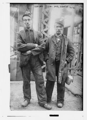 Two miners ready to leave entrance of coal mine near Scranton, PA.